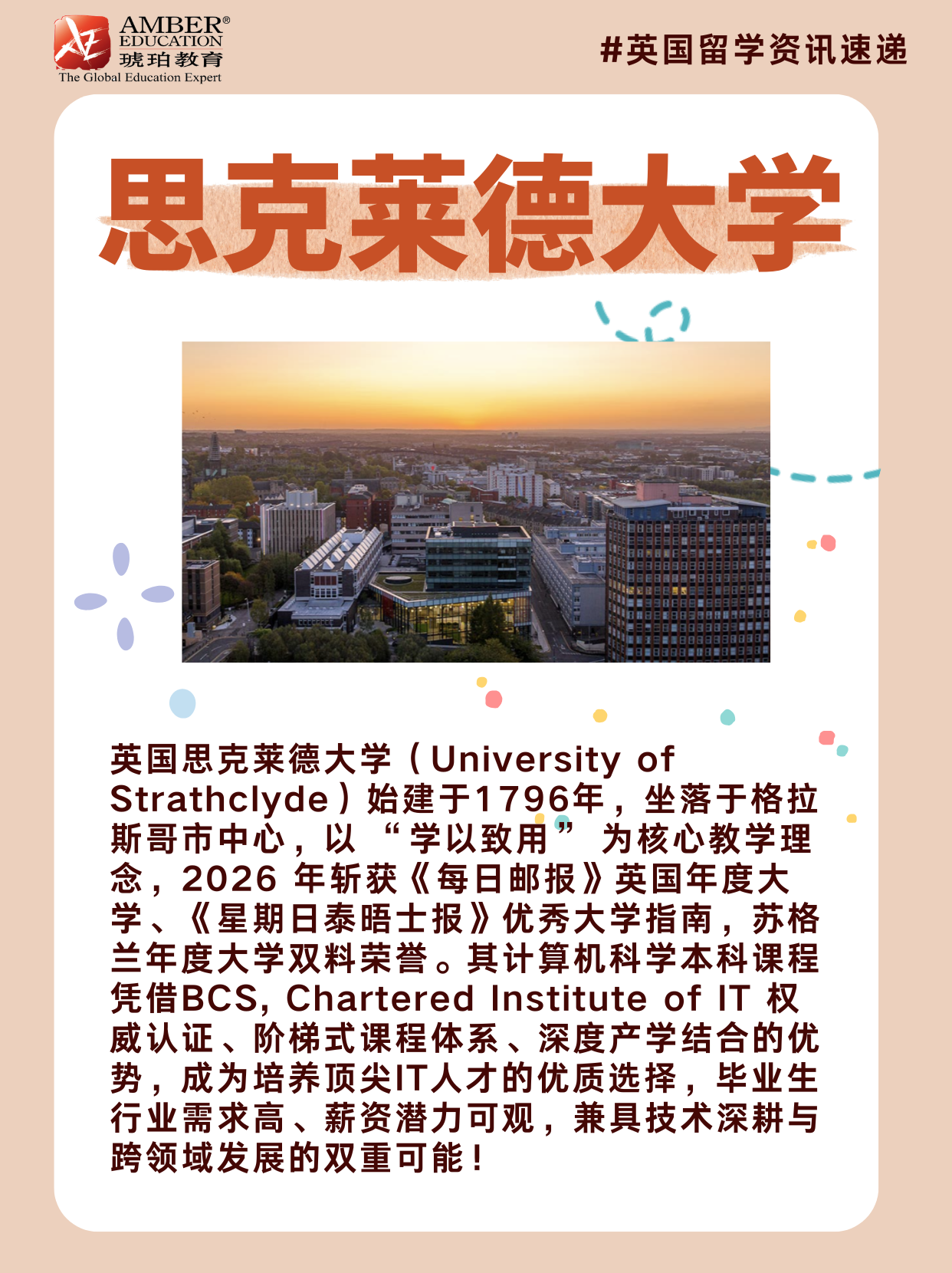 📍英国思克莱德大学(University of Strathclyde)始建于1796年,坐落于格拉斯哥市中心,以 “学以致用” 为核心教学理念,2026 年斩获《每日邮报》英国年度大学、《星期日泰晤士报》优秀大学指南,苏格兰年度大学双料荣誉。