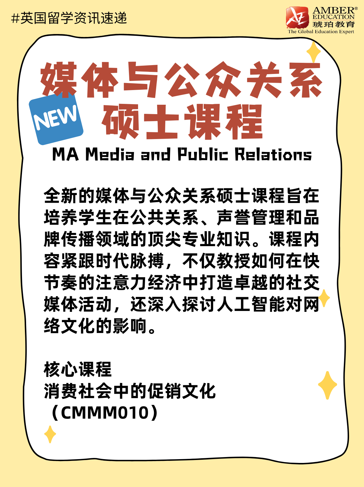 MA Media and Public Relations全新的媒体与公众关系硕士课程旨在培养学生在公共关系、声誉管理和品牌传播领域的顶尖专业知识。课程内容紧跟时代脉搏,不仅教授如何在快节奏的注意力经济中打造卓越的社交媒体活动,还深入探讨人工智能对网络文化的影响。