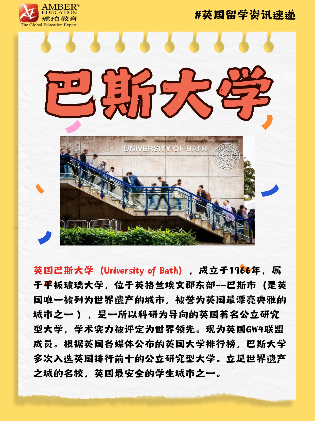 🇬🇧英国巴斯大学(University of Bath),成立于1966年,属于平板玻璃大学,位于英格兰埃文郡东部——巴斯市(是英国唯一被列为世界遗产的城市,被誉为英国最漂亮典雅的城市之一 ),是一所以科研为导向的英国著名公立研究型大学,学术实力被评定为世界领先。