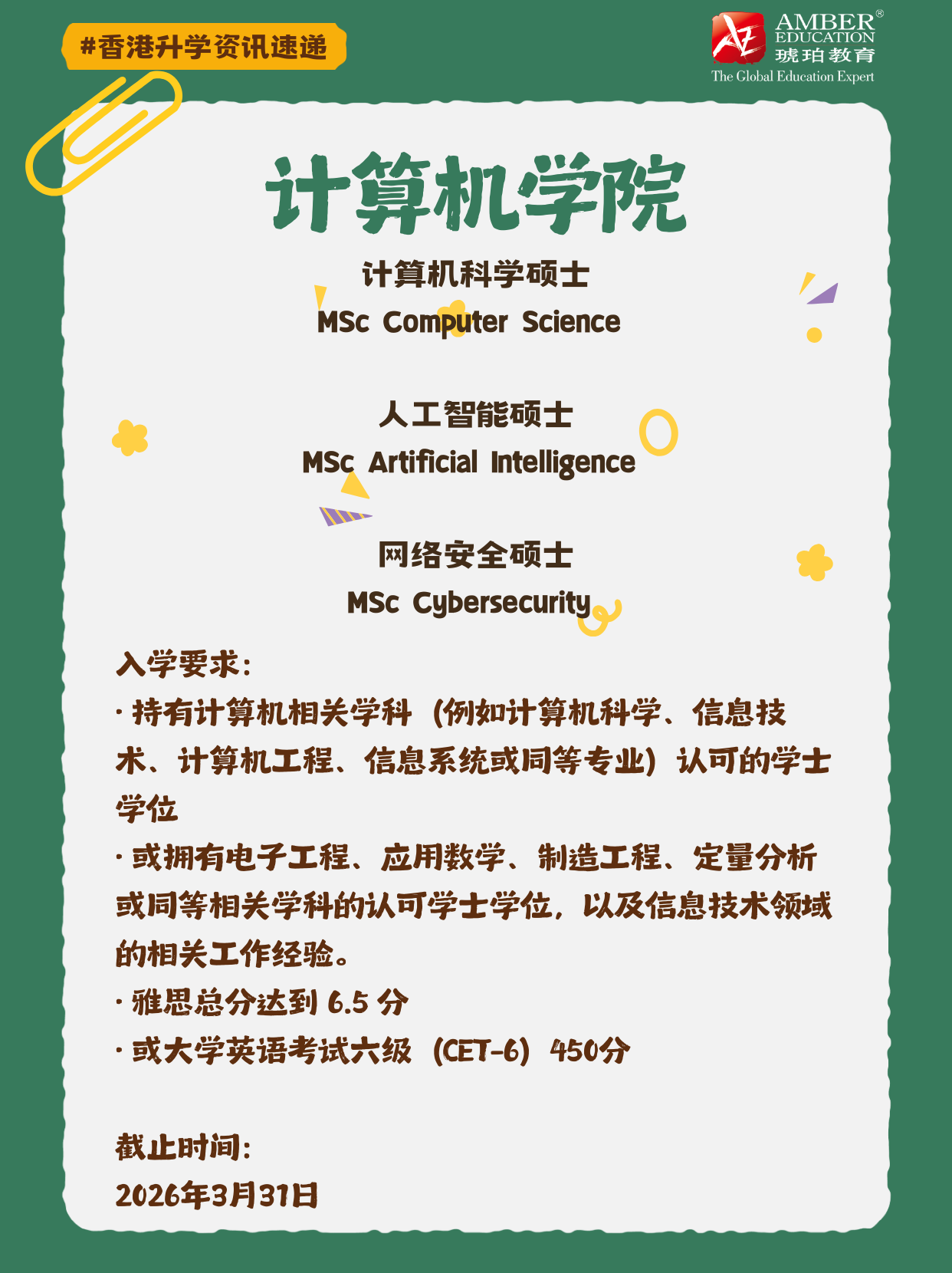 错过港城大硕士申请别慌!三大学院6个硕士专业申请截止日期延长啦👏 原本1月底截止的计算机科学、人工智能等热门专业,现在延长到2月底或3月底。部分专业接受六级成绩,跨专业申请友好。无论你是想提升学历,还是转换赛道,这都是难得的捡漏机会,赶紧抓住这波福利,开启你的港硕之旅吧💪