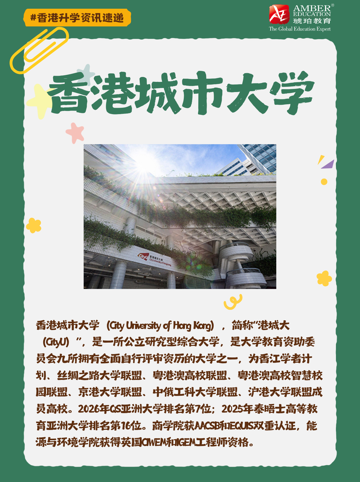 🇭🇰香港城市大学(City University of Hong Kong),简称“港城大(CityU)”,是一所公立研究型综合大学,是大学教育资助委员会九所拥有全面自行评审资历的大学之一。2026年QS亚洲大学排名第7位;2025年泰晤士高等教育亚洲大学排名第16位。商学院获AACSB和EQUIS双重认证,能源与环境学院获得英国CIWEM和IGEM工程师资格。